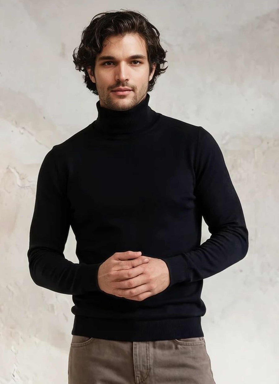 The 'Kelso' black roll neck pullover with rib basque is made from 100% Australian Merino machine washable wool.