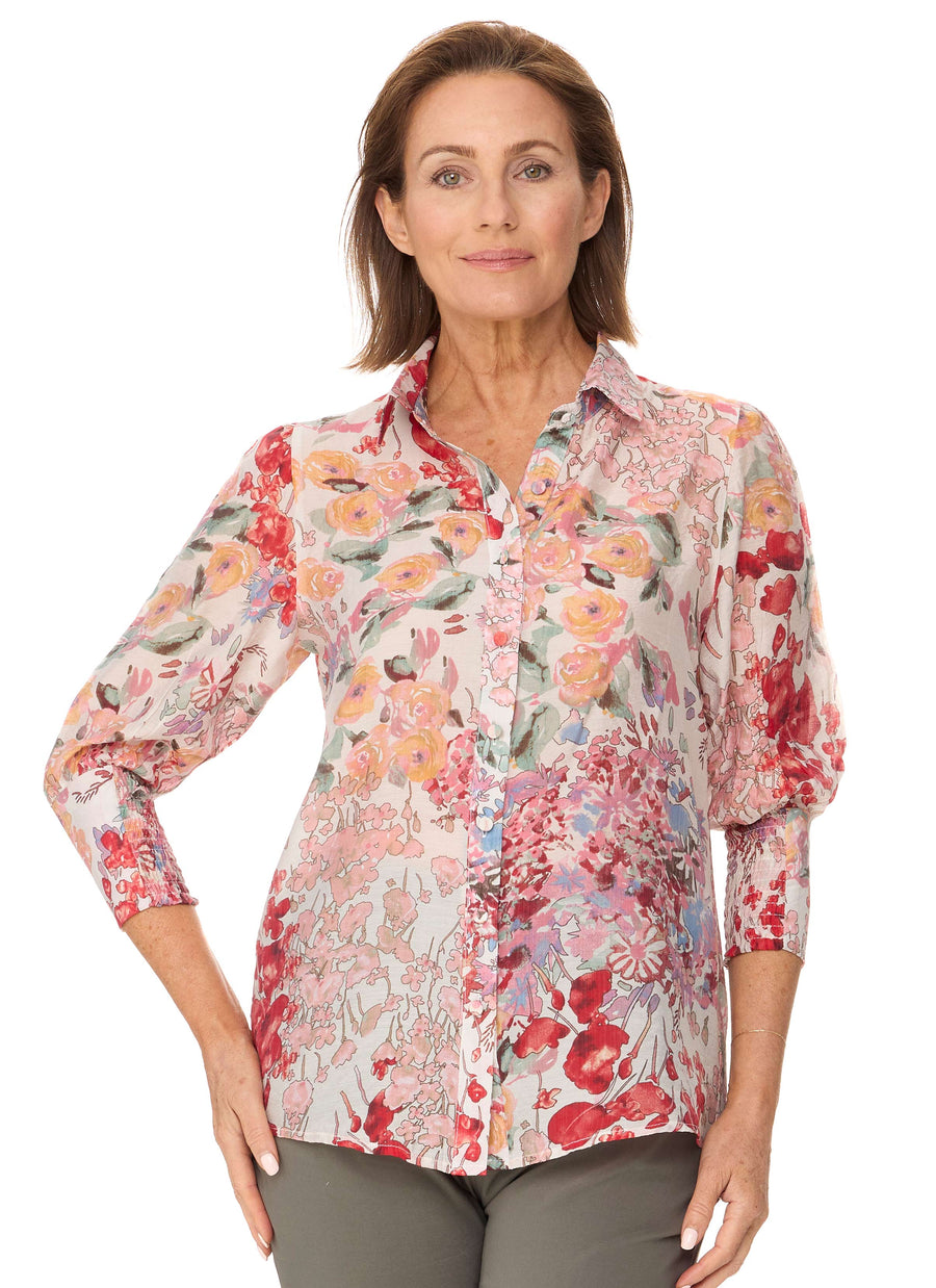 The 'Nonda' is a Pure Cotton 3/4 sleeve shirt/blouse in a classic summer print from Callan Designs. It features a button up front and makes a great match with many of our summer pants or shorts.